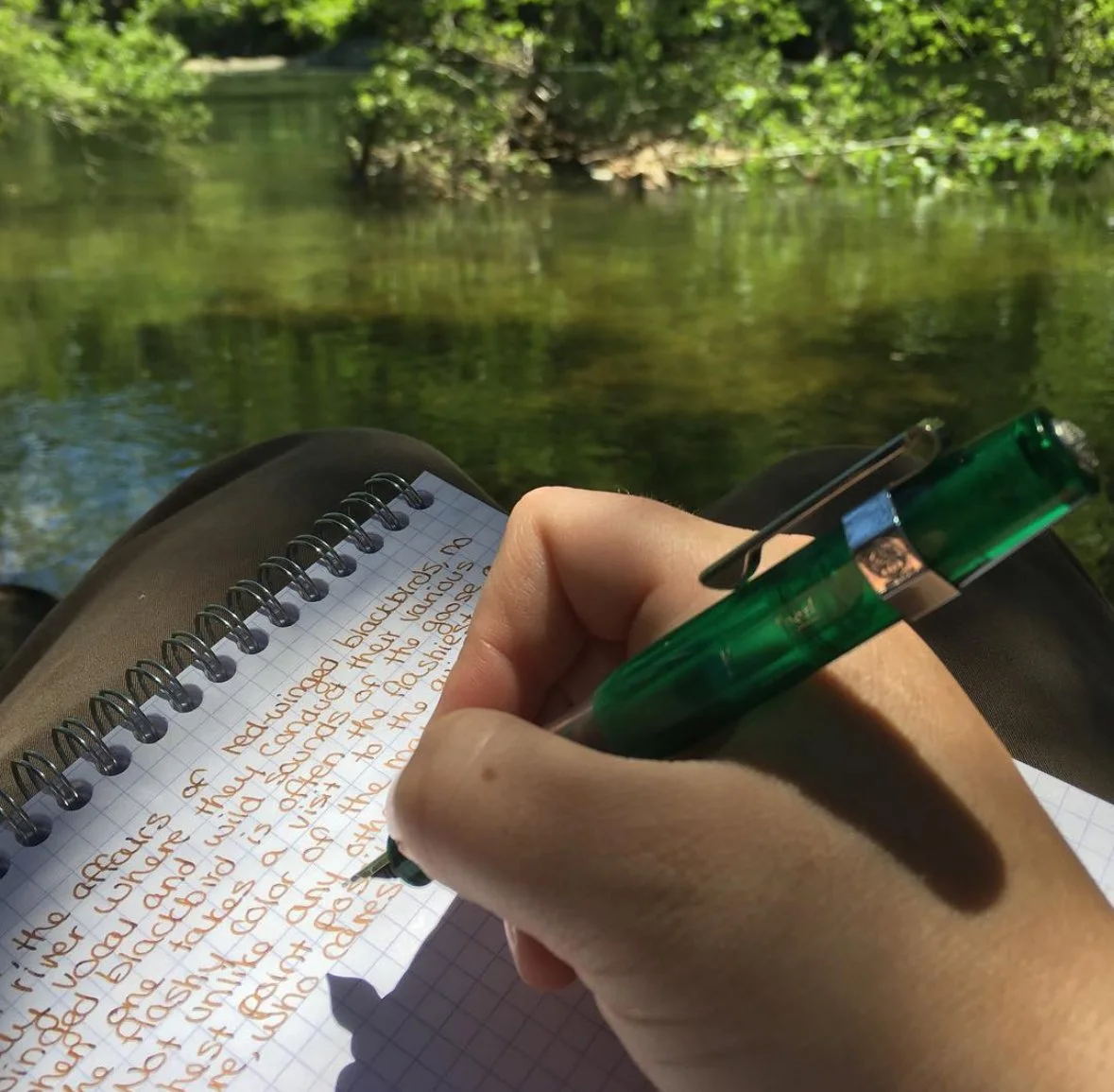 POV writing beside a river in Yosemite National Park. This pen is definitely well-loved. You could still see the words on the cap for the most part in 2017… nowadays they are pretty much rubbed off from use. It’s actually pretty amusing that I had orange ink in this pen and also orange in it when I went looking for old photos of it.