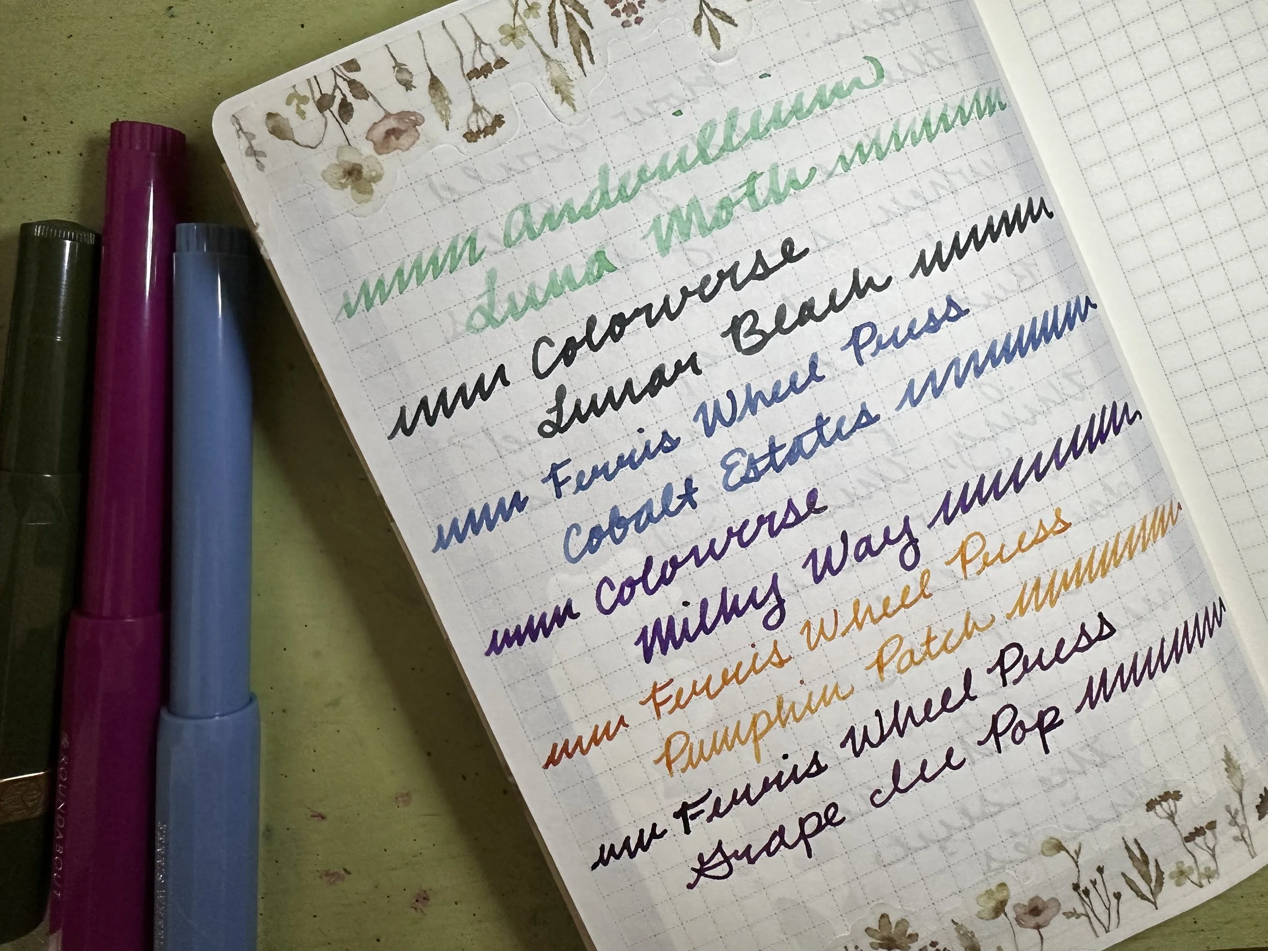 I was leaning towards darker colors overall and steering away from super loud colors (other than FWP Mechanics of the Stars and Diamine Jacaranda. Sailor 280 and Teranishi Gentle Green got so many fills because I used them for several of my workshops because I think they show off shading properties of fountain pen ink really well. CV Bow Shock was tapped to show off sheen.