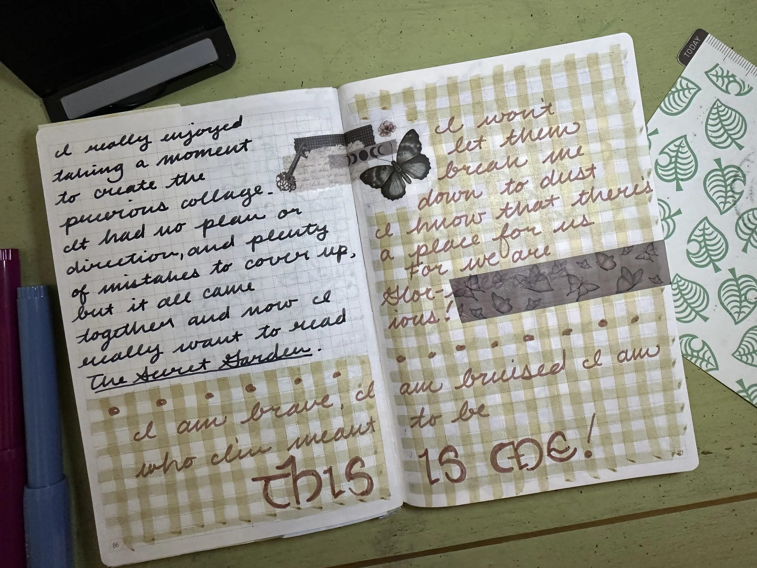 Some notes about a collage I’d done on a previous page and a plaid artsy scribble with random song lyrics (This is Me from the Greatest Showman).