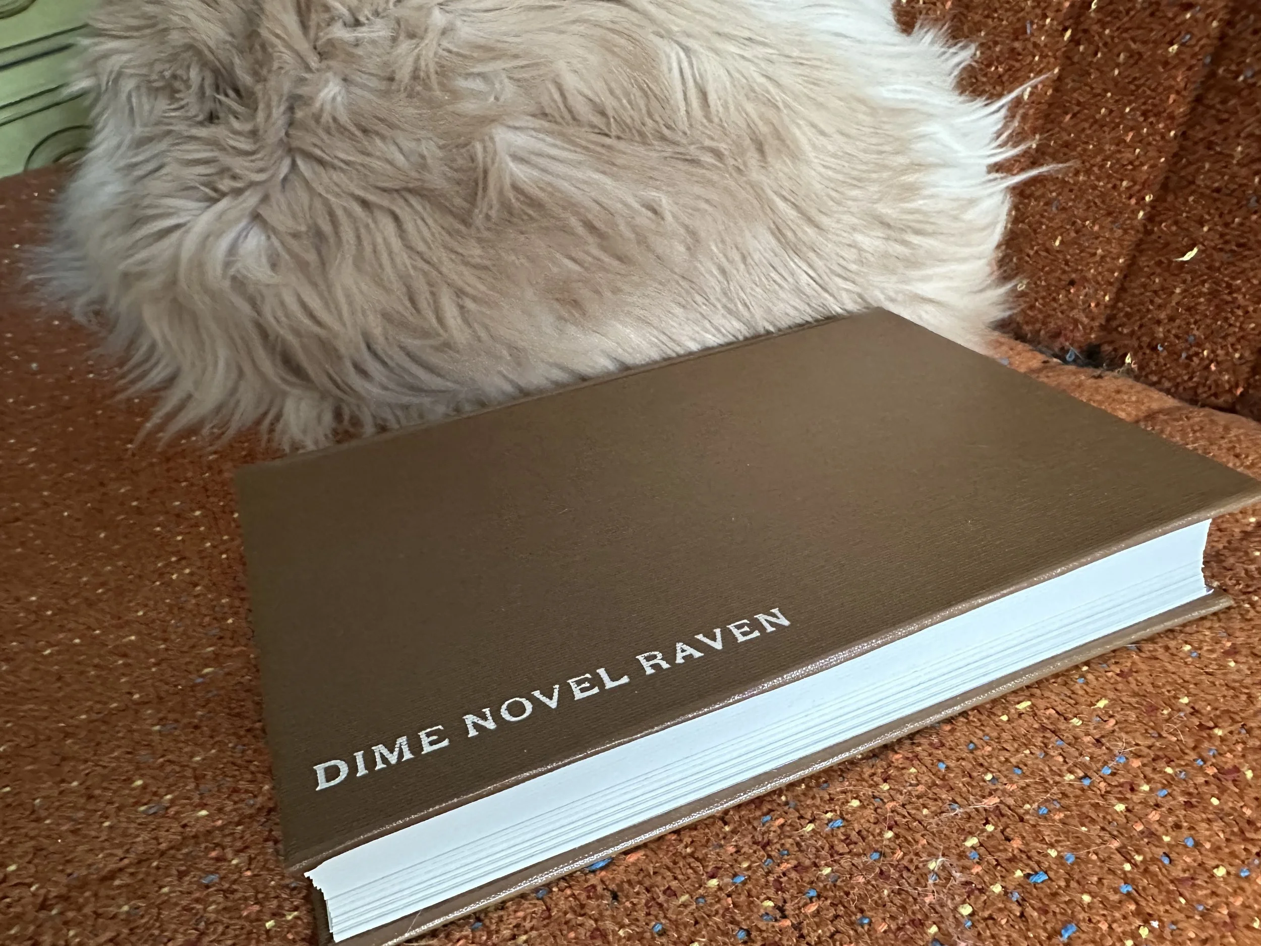 A hand-bound book that I made while taking a class on bookbinding I took in February/March. I completely miscounted the signatures so no idea how many pages there are, haha. Seen here on my desk chair ith a fuzzy orange cat backdrop.