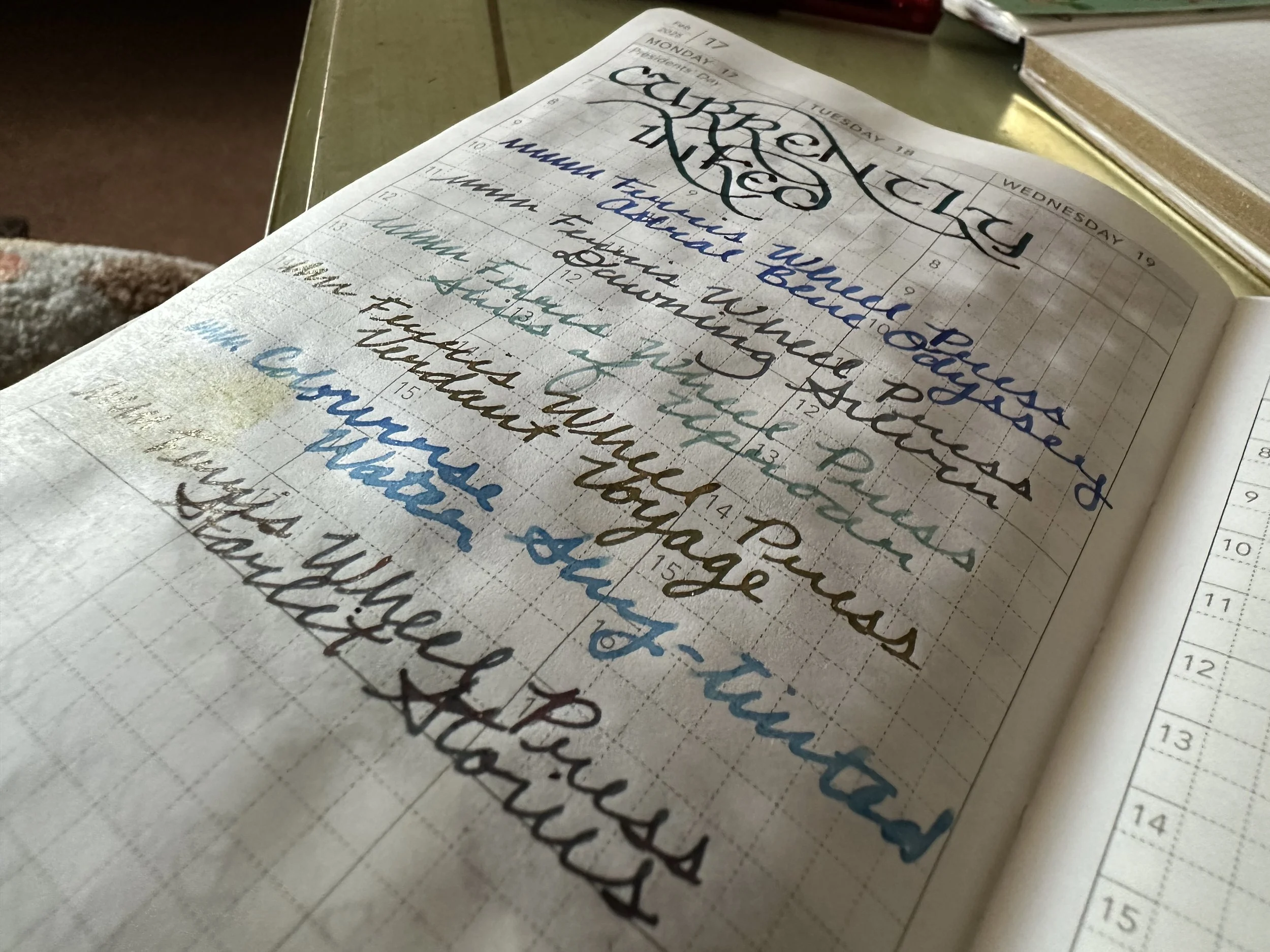 Ferris Wheel Press Starlit Stories - FWP Carousel Granite Guardians M - This was another ink that I put in a pen for my workshop attendees to play with. I also wanted to compare it to the new FWP Embers of Time ink (they look nothing alike, don’t know why I thought they were similar - Embers is gray and red shimmer, while this is dark blue and purple shimmer). This combo is really interesting and I’m still not quite sure its working for me as a color scheme. Ink works great though, flowing well even after a few days of not messing around with it.