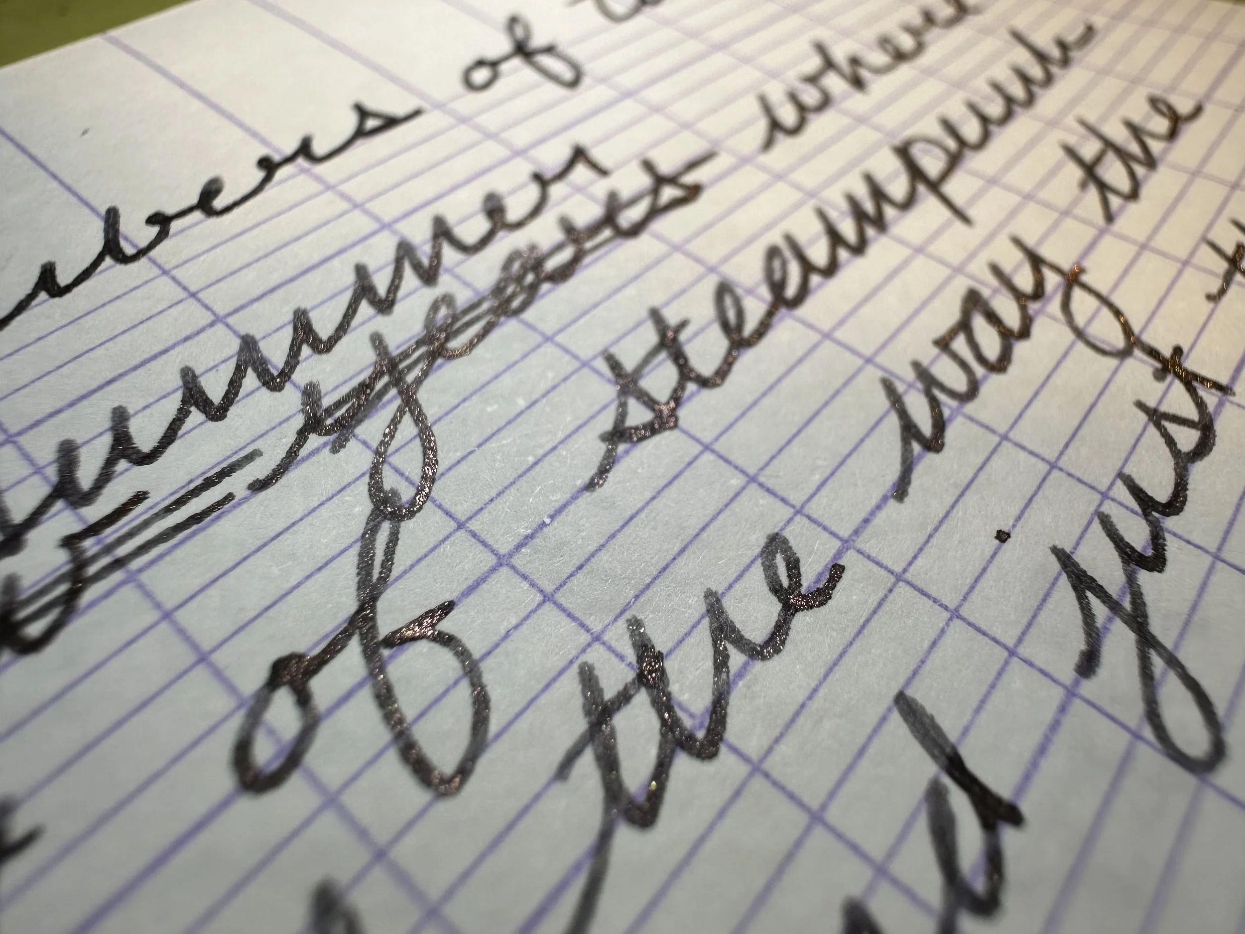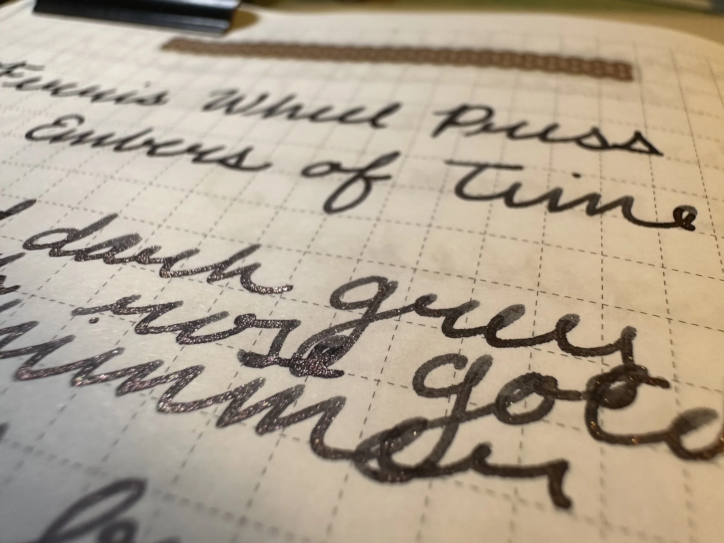 Embers of Time is a dark gray ink with rose-gold shimmer. It does shade, but it’s minimal, not very dramatic. The flow is wet enough that I haven’t had any trouble with clogging, even when it’s been getting banged around along with my Kaweco liliput fireblue in my pocket or falling on the floor. However, like all shimmer inks it does need to be agitated in order to keep showing up in the letters. I do this by tilting my pen back and forth a few times and then continuing to write. It was pleasant to write with. I’ve been enjoying the mix of shimmers being utilized by different pen brands these days. We have come really far from silver and gold being the most available options.
