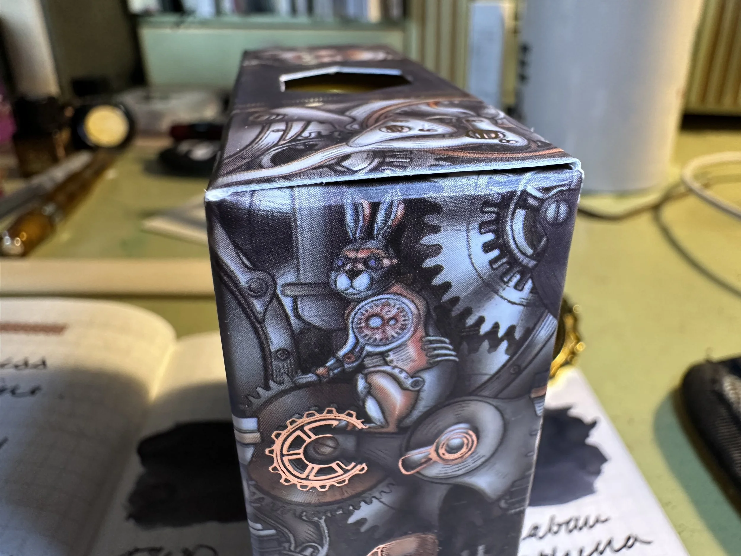 FWP has it dialed in on design (I think the founders are all graphic designers, so it makes sense). The bottle is their 38 mL “perfume” bottle, although it can be found in their 10 mL “ink pot” as well. The box design is beautiful and I’ve had it hanging out on my desk since I’ve inked it up. The box has copper accents and images of gears and a large clock. There are even a few steampunk-clad rabbit engineers hidden in the design. Box is pretty and ink is functional, a good combo.