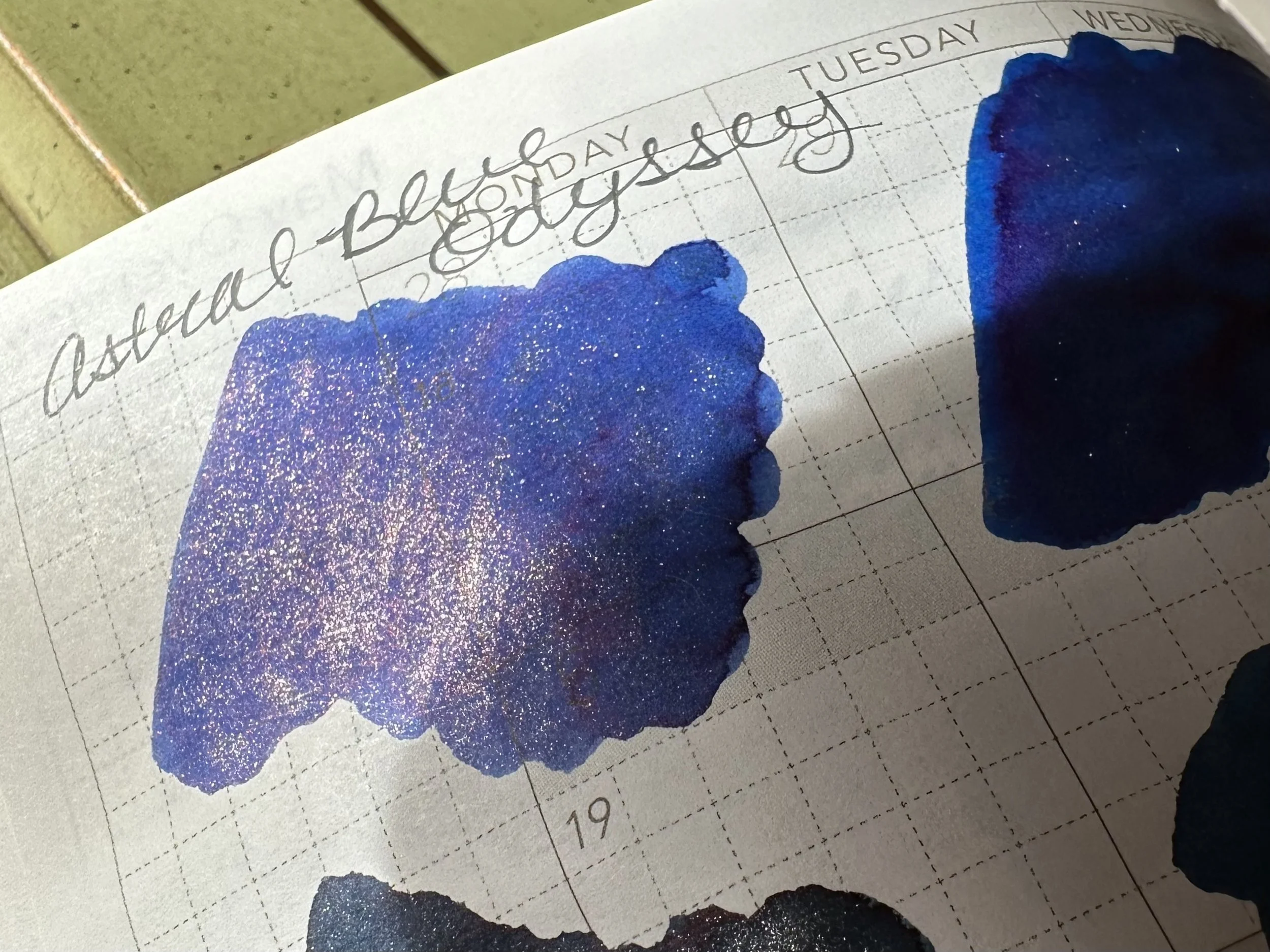 Astral Blue Odyssey comes in the 38 mL standard bottle from FWP, reminiscent of a perfume bottle. I usually make sure I have a finger on either side of the bottle when I am sticking my nib into it for filling, which can lead to some ink on my fingers, especially if the rubber seal didn’t stay in the cap. To get the shimmer to suspend I tip the bottle back and forth until all of the settled shimmer particles are no longer on the bottom.