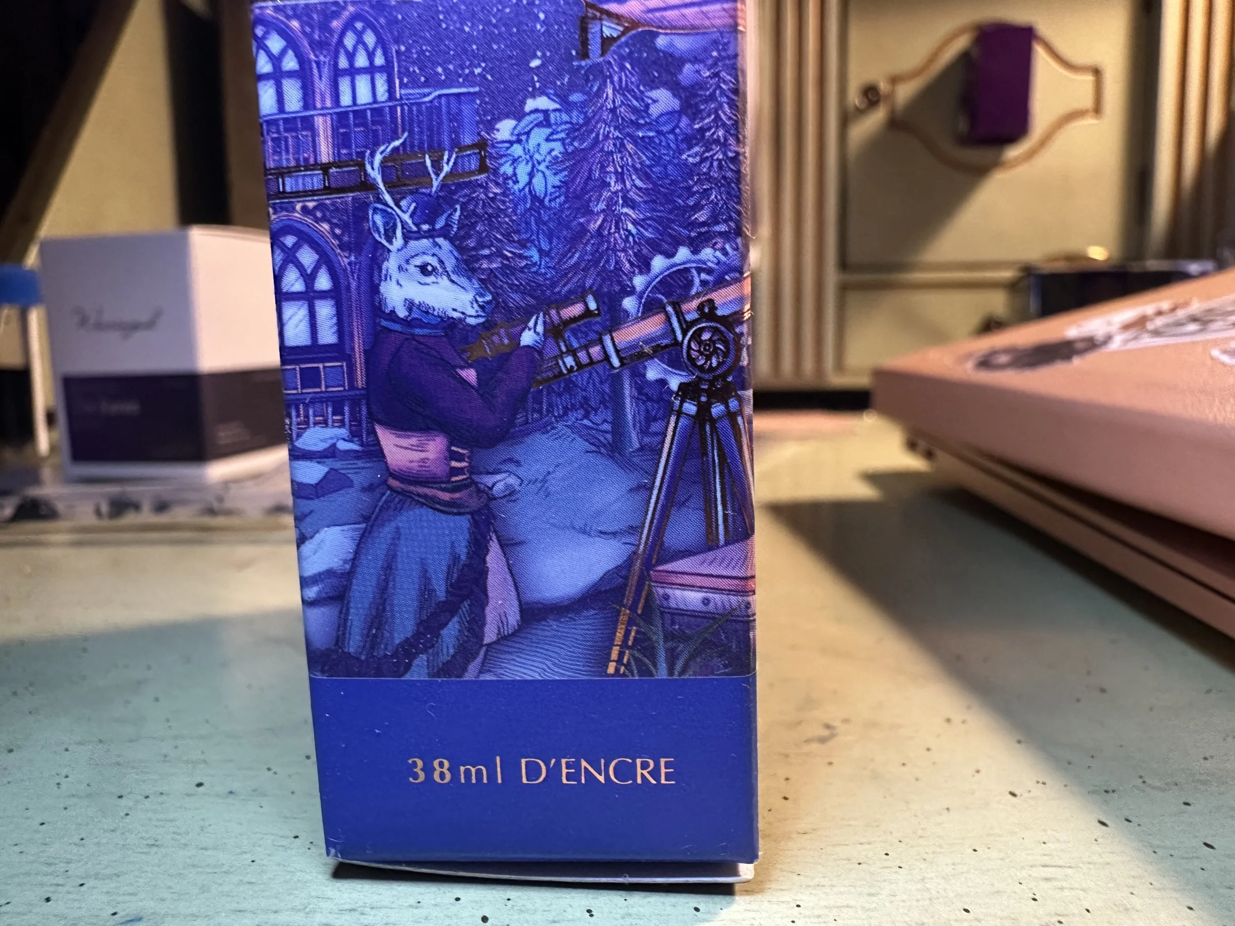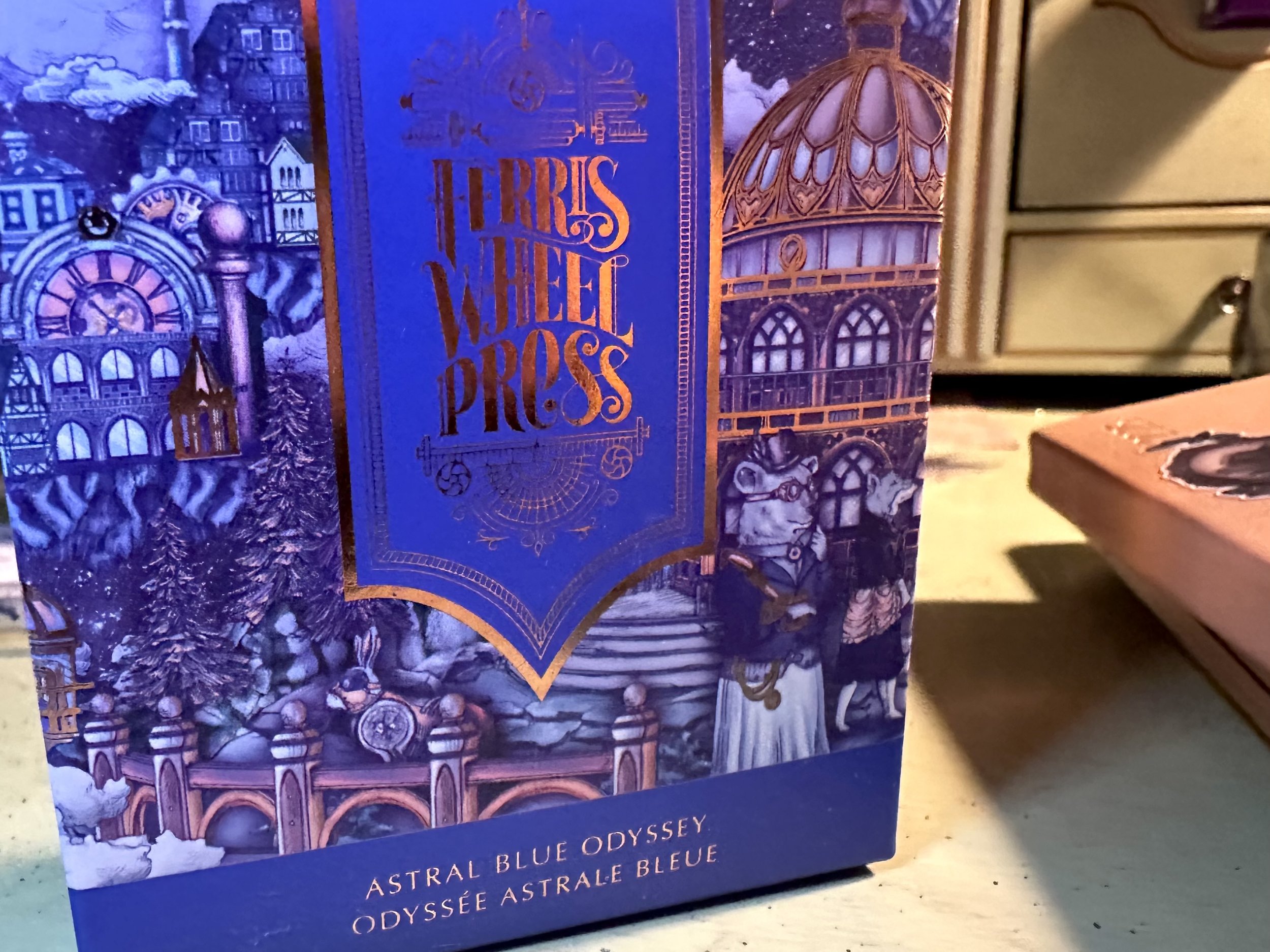 Beneath a sky strewn with stars, clockwork observatories turn and airships drift through the deep blue void… Ink tone: Sheening saturated blue with rose gold shimmer.