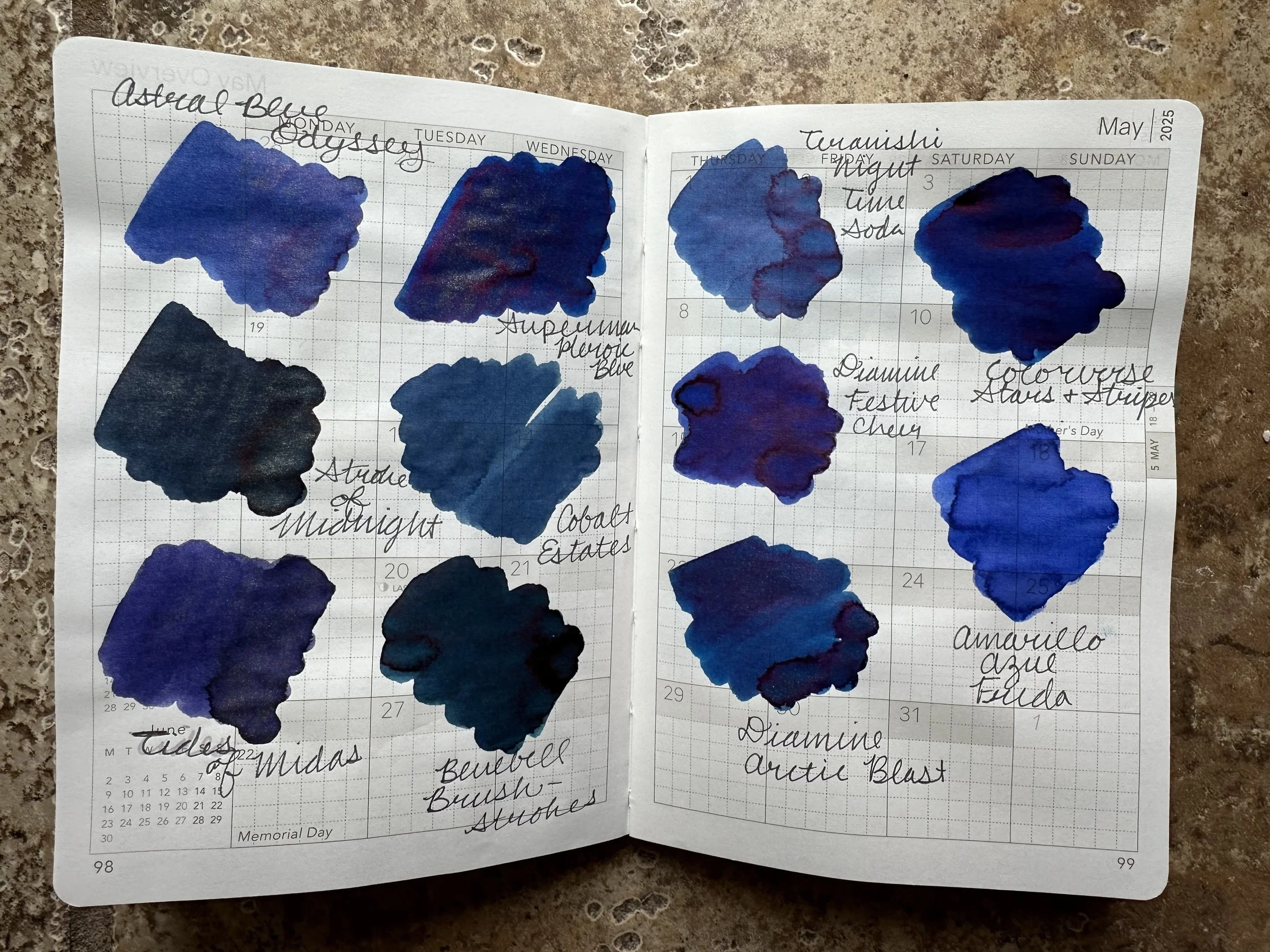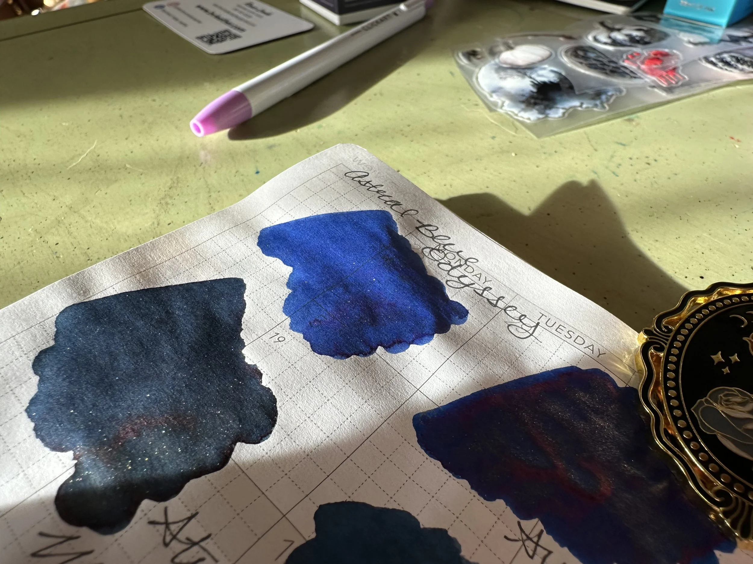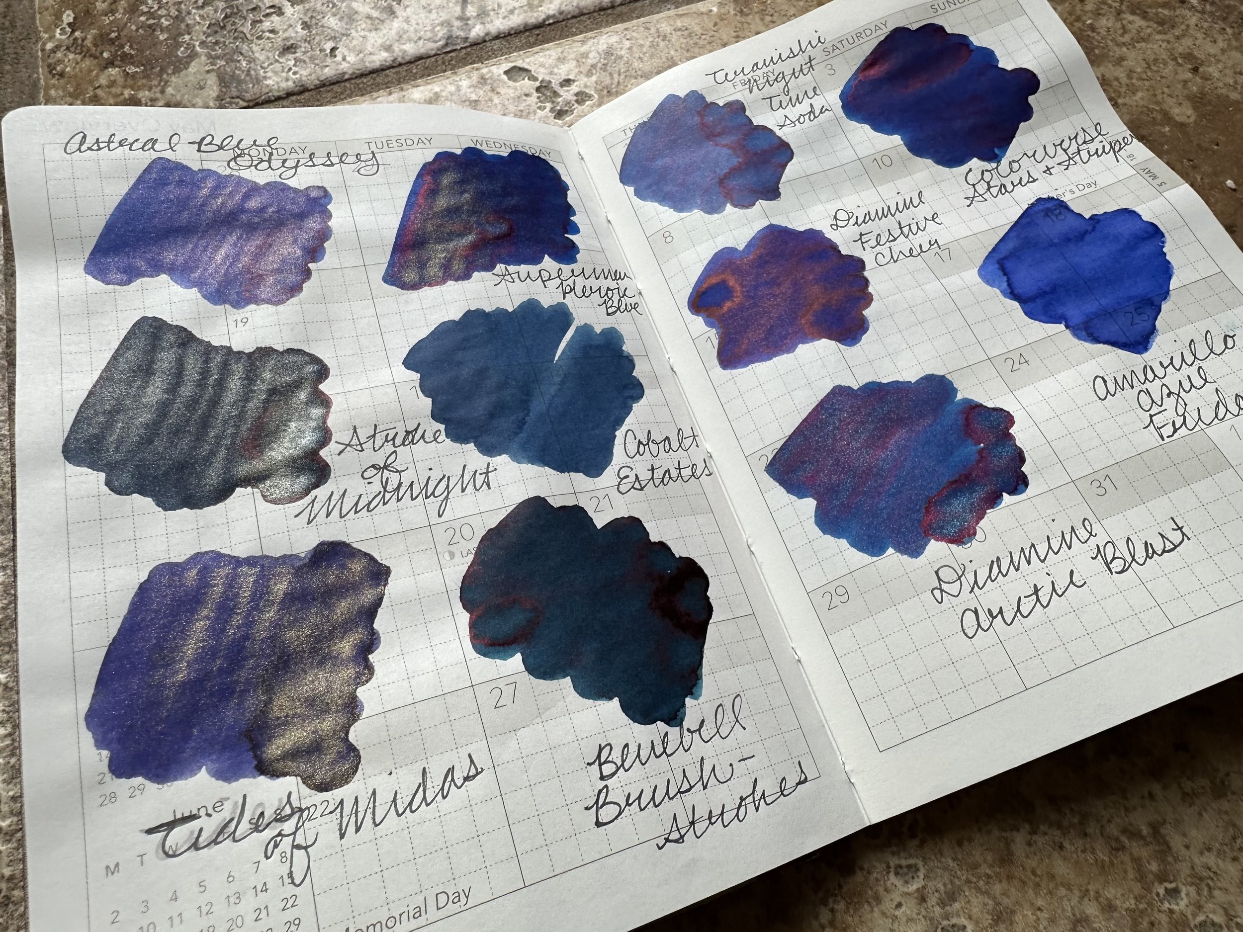 It can be said that sheening blues are overdone. Many brands offer them these days. For me, the OG sheening blue was Organic Studios Nitrogen. It was a super sheener and like most super sheeners it had the danger of dried ink particles ending up on any and all surfaces. It was difficult to know if a flake had gotten on something unless it got wet, then there was suddenly blue everywhere. Sheening blues have come a long way from those early days and are generally much more stable and well-behaved. Really long dry times are also down unless laying down a lot of ink.