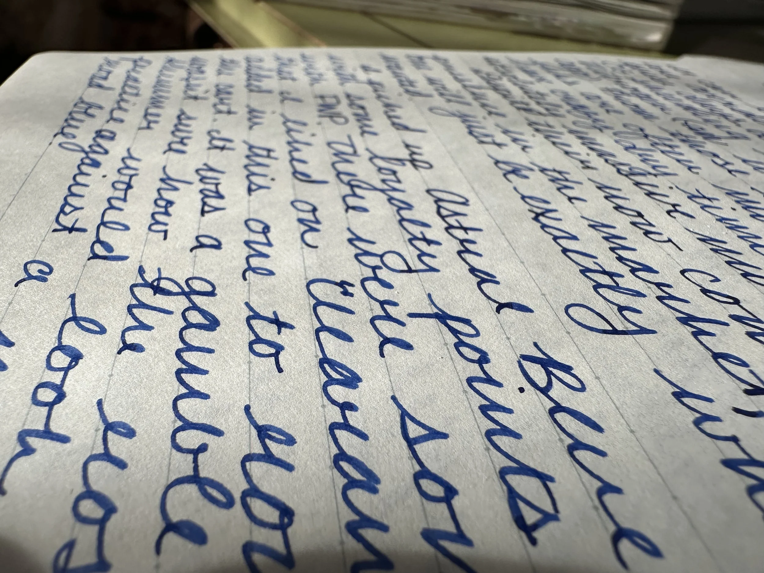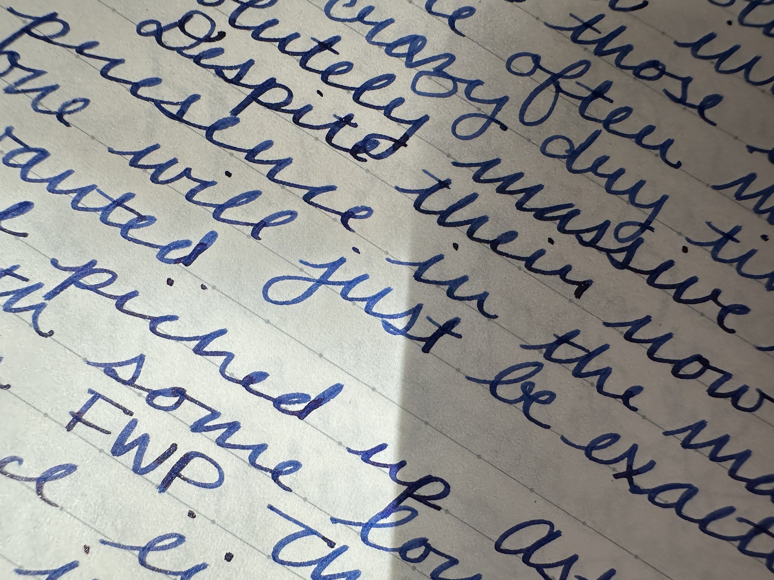 I’ve been using this ink almost non-stop for a few weeks. I’ve probably refilled the tiny converter on my Kaweco liliput copper about 4 times. Overall, the ink has a dry flow and, typical of most shimmer inks, will often have more shimmer at the start of writing rather than further down the page. Without any adjustments, this ink has a dry flow, but I never had trouble with it stopping writing. There were some hard starts if I paused for too long, but if I capped the pen and let it sit for a moment (or added a little moisture to it) writing would begin again right away. This ink fits a lot of my boxes of what I really like in an ink, the rose-gold shimmer adds some whimsy when the light catches it, but otherwise it just looks like a fun blue with a hint of pink sheen. It dries fairly quickly, although I may have to dab with some blotting paper before turning a page.
