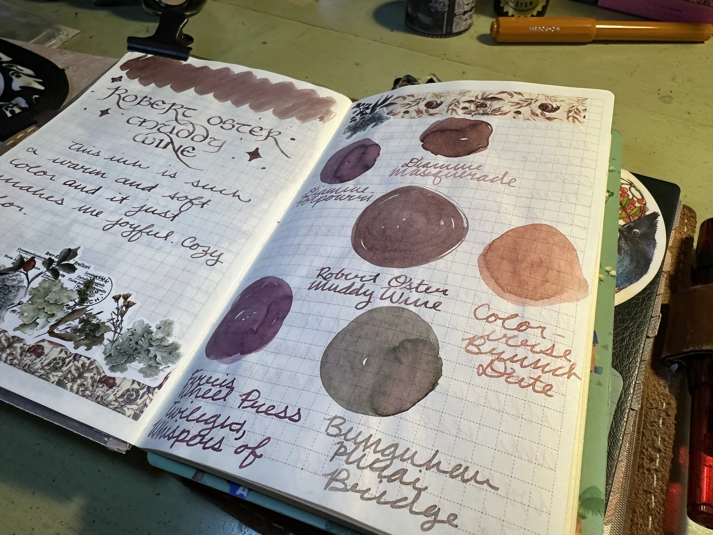 Muddy Wine is the purple in the lineup. It falls into the “warm purple” zone, although it can lean towards brown-purple or red-purple on different papers and in different lights. While warm purples have become more common in recent years, when Muddy Wine came out it was the only one I had seen. At the time I was in a burgundy/wine ink phase and I think I used the sample through without even swapping inks somewhere in the middle. When that happens I add an ink to my bottle list.